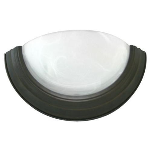 Half moon alabaster glass wall sconce with an oil rubbed bronze trim finish. 12" diameter. For use in living rooms, bedrooms, bathrooms, and laundry rooms. Instant start and flicker free. Quick run-up time. Comes with a 2 year warranty. Easy installation. Includes a self-ballast GU-24 lamp. Energy Star Qualified.