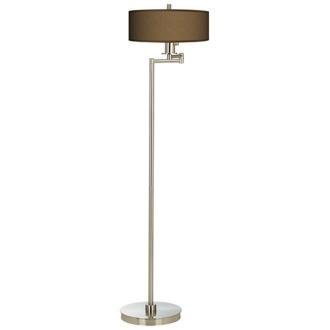 Function and style meet in this sleek, energy efficient floor lamp design. Top swing arm adjusts for reading or other tasks. Energy saving design uses two CFL bulbs. The canvas drum shade features a custom printed pattern. Base is in a brushed steel finish. On-off switch on socket. U.S. Patent # 7,347,593. Brushed steel finish. Custom giclee shade. Includes two 13 watt CFL bulbs. 65 1/2" high. 11 1/2" wide base. Shade is 14" wide and 5 1/2" high.